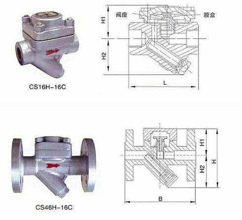 CS16H、CS46H膜盒式蒸汽疏水阀(蒸汽压力平衡式)是目前国际上常用的先进节能型疏水阀。膜盒式蒸汽疏水阀的反应非常灵敏,工作时阀前存有高温凝结水,无蒸汽泄漏,节能效果显著。
